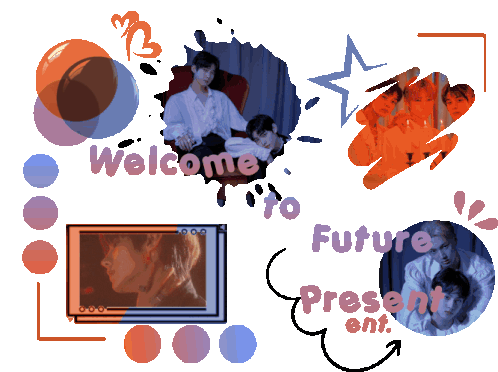 An animated collage featuring K-pop group Enhypen, with 'Welcome to Future Present' text and dynamic visuals.