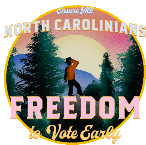 Sticker advocating for the freedom to vote early for all North Carolinians, set against a scenic nature backdrop.