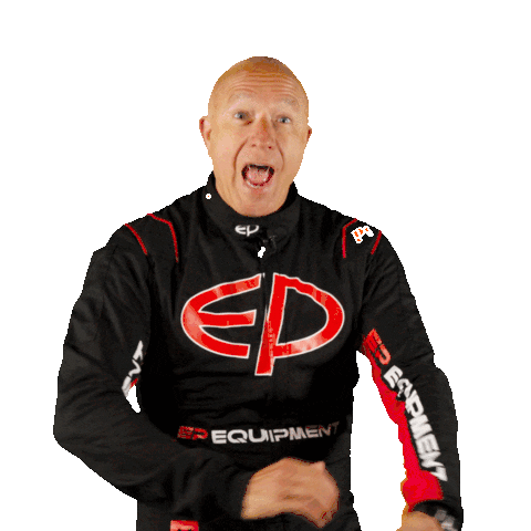 a man wearing a black and red ed equipment shirt is making a funny face