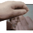 A hand holds a picture of Eren Kaya's face in front of a mirror, then gives a middle finger gesture.