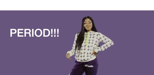 Erica Nlewedim confidently performs a 'Period Hair Flip' gesture, with the text 'PERIOD!!!' displayed prominently.