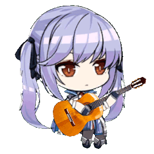 Essex from Azur Lane, a chibi anime girl with purple hair, plays an orange acoustic guitar with a gentle sway.
