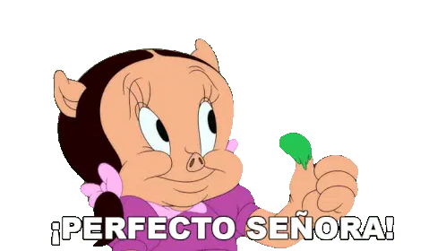 Petunia Pig from Looney Tunes peeks over a fence, asking '¿Está Bien?' with a concerned expression.
