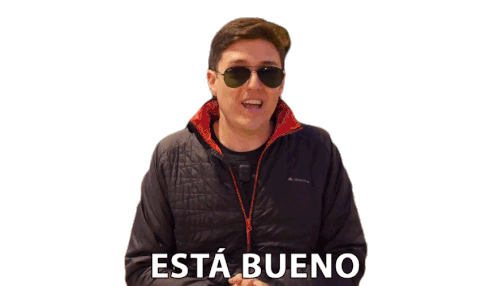 A man in sunglasses and a jacket shrugs with open hands, saying "Está Bueno" (It's good/fine), indicating approval or agreement.