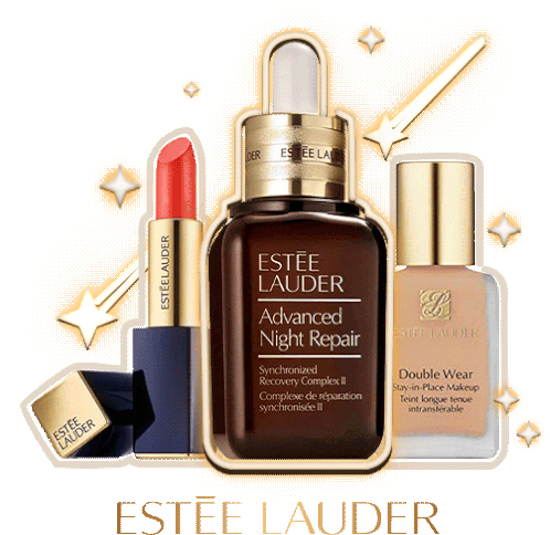 Estée Lauder's iconic Advanced Night Repair serum, a vibrant red lipstick, and Double Wear foundation, sparkling with magic.