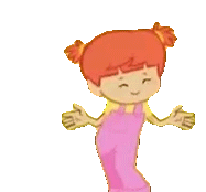 A cheerful cartoon girl from Galinha Pintadinha dances happily, exclaiming 'Eu Sacudi' (I Shook).