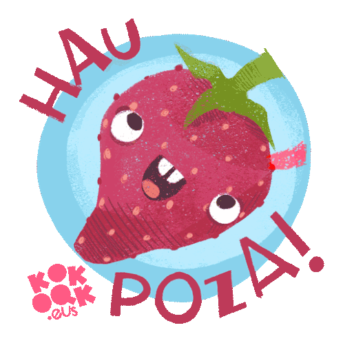 A cheerful animated strawberry exclaims 'Hau Poza!' (What Joy!) in Basque, radiating happiness and fun.