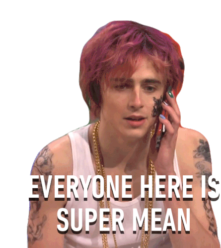 Timothée Chalamet as a character with pink hair and tattoos, looking upset while talking on the phone and saying "Everyone here is super mean."