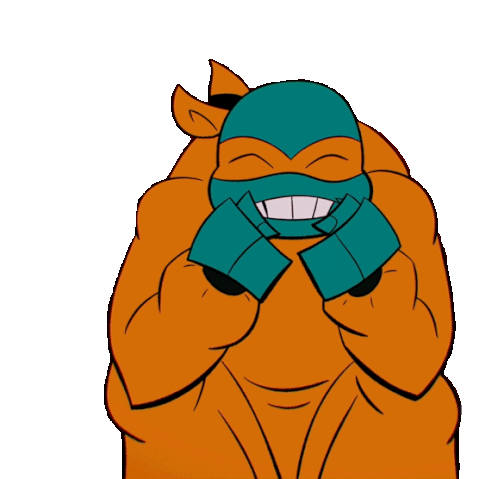 Mikey from Rise of the Teenage Mutant Ninja Turtles is excited and giddy, covering his face with joy.