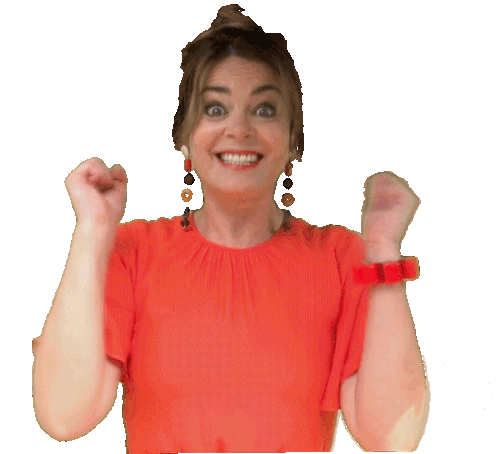 Kim Lian Van Der Meij expresses extreme excitement and surprise, hands raised, with a wide, joyful smile.