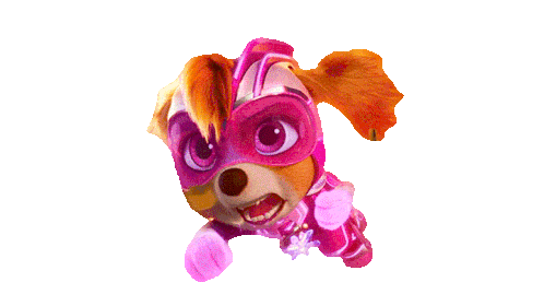 Skye from Paw Patrol, in her Mighty Pups superhero costume, shows an intense and determined expression, ready for action.