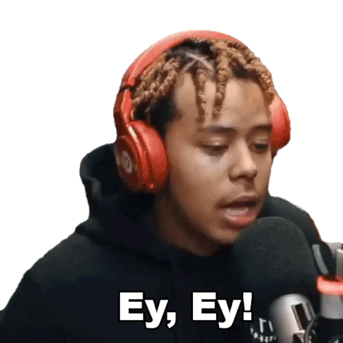 Rapper YBN Cordae wearing red headphones, nodding his head to the beat, with the caption 'Ey, Ey!' displayed.