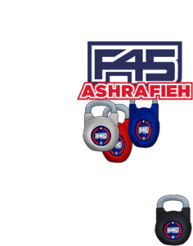 Animated F45 Ashrafieh logo with various colored kettlebells, showcasing fitness equipment for F45 Training in Beirut.