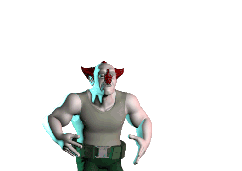Fabiano Gama, a clown-like character, raises his arms high above his head in a gesture of triumph or surrender.