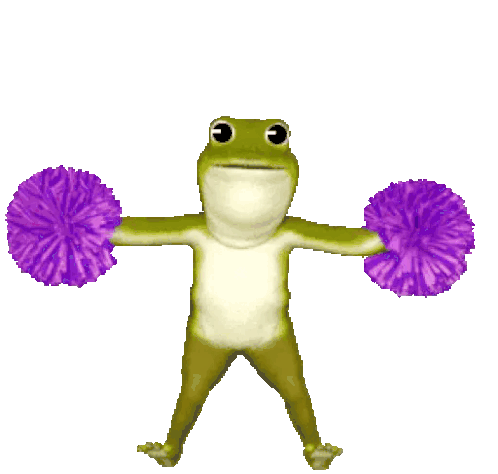 An animated green frog, associated with Fabifalsetti and Elmeiniteam, dances energetically with two purple pom-poms.