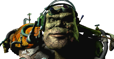 Marcus, the Super Mutant talking head from Fallout 2, animated with his characteristic grim expression and cybernetic implants.