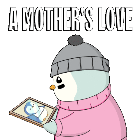A cute pudgy penguin, wearing a pink sweater and grey beanie, gazes lovingly at a framed photo of its baby, expressing 'A Mother's Love'.