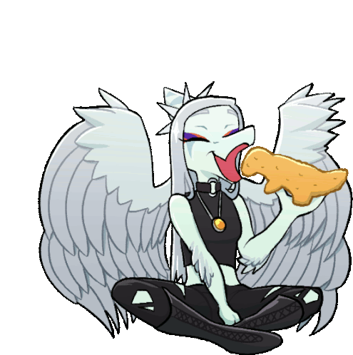 a cartoon drawing of a woman with wings eating a pizza