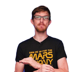 Julian Huguet, wearing a 'Sign Me Up For The Mars Colony' shirt, enthusiastically spreads his hands.