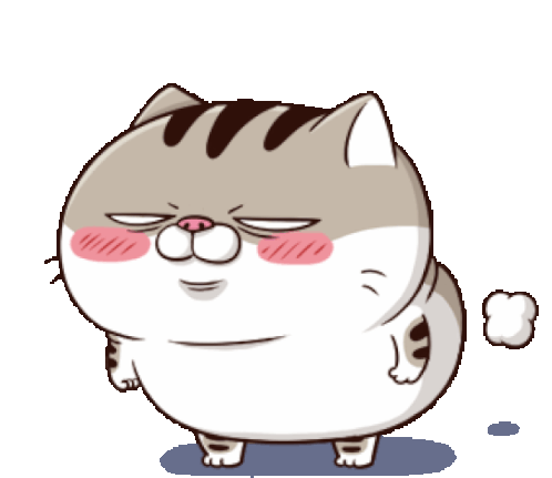 A chubby cartoon cat with rosy cheeks stands with eyes closed as a small puff of smoke emerges from its tail, indicating a funny fart.