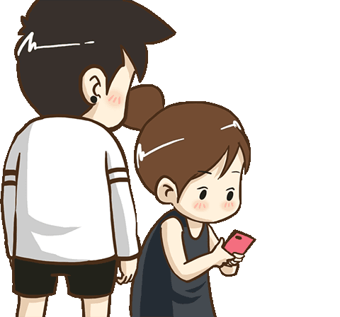 A cute cartoon couple, where the man farts while standing behind the woman who is engrossed in her phone, leading to a humorous reaction.