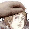 Fat Yosuke Hanamura from Persona 4 in pixel art, showing an action like putting on a hat or petting.