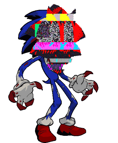 A terrifying, glitch-corrupted Sonic.exe character with sharp teeth and bloody hands, depicting a fatal error.