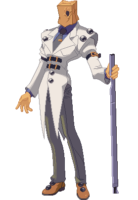 Faust from Guilty Gear, a tall character with a paper bag head and white coat, gestures while holding his signature scalpel.