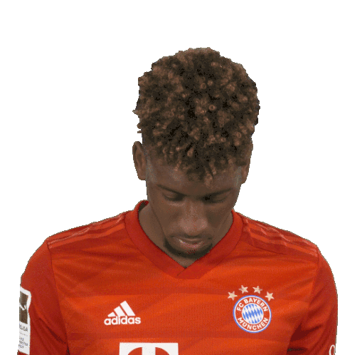 Kingsley Coman, the FC Bayern Munich star, shows a happy smile in his red club jersey. A cheerful moment from the football player.
