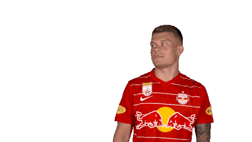 Kamil Piatkowski, a player for FC Red Bull Salzburg, points at the viewer with a big smile.