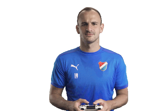 A football player from Fcbanikostrava, wearing a blue jersey, holds a game controller and makes a fist pump.