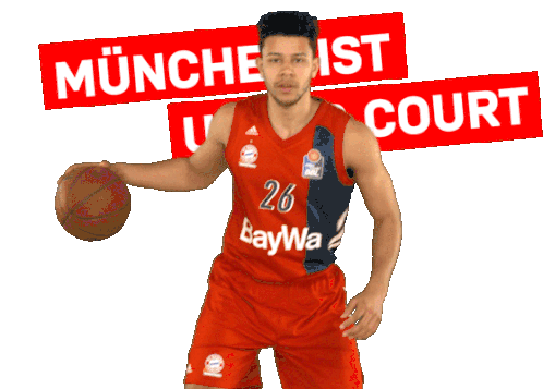 FC Bayern Munich basketball player (number 26) holds a ball, with 'München ist unser Court' text. Features Ogunsipe.