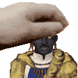 A pixel art sticker from Fear And Hunger, featuring a hand holding a statue of O'saa's head, in a dark, gritty style.