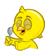 A cute Galinha Pintadinha chick blinks and holds a spoon, eagerly asking to be fed. Perfect for expressing hunger!