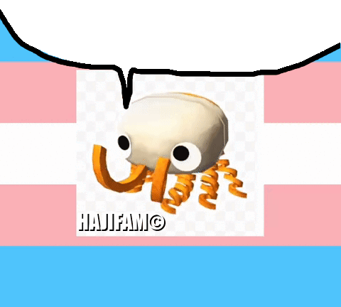A quirky Bunger creature with curly fry legs and a speech bubble, set against the vibrant transgender flag background.