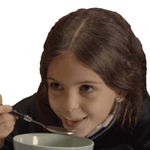 Camila, a young girl, smiles brightly and laughs while enjoying a meal from a bowl with a spoon.