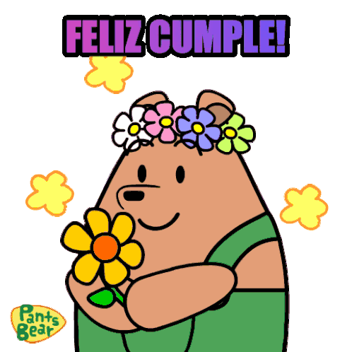 Pants Bear celebrates a birthday, wearing a flower crown and holding a flower, with 'Feliz Cumple!' text.