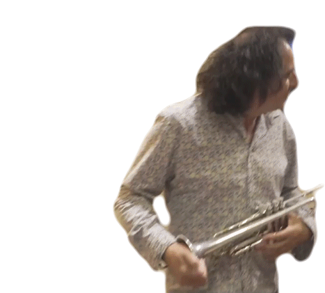 Man from Taburete band, looking happy while holding a silver trumpet. He is ready to play music.