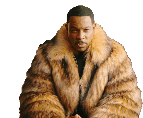 a man wearing a fur coat with a black shirt underneath it