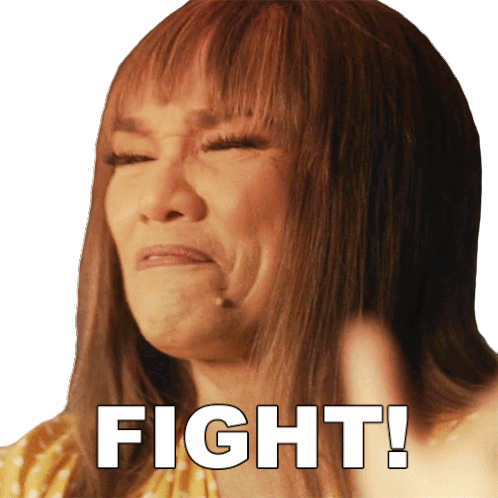 Carolyn from Haus Of Vicious shows a determined, fighting expression with the word 'FIGHT!' displayed.