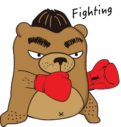 A determined cartoon bear-like character in red boxing gloves, ready for a fight, with an encouraging 'Fighting' caption.