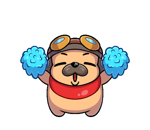 A cute cartoon pug in a pilot helmet and goggles cheers enthusiastically with blue pom-poms, showing fighting spirit.