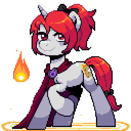 Pixel art unicorn mage from Final Verse with red hair, a cape, and a floating fireball, standing on a magical circle.