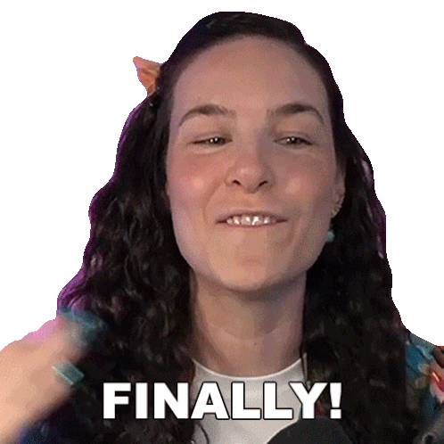 Cristine Raquel Rotenberg excitedly exclaims "Finally!" with a big smile, celebrating a long-awaited moment.