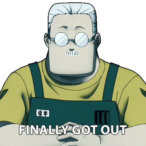 Taro Sakamoto from Sakamoto Days, wearing an apron, with the caption 'Finally Got Out', expressing relief.