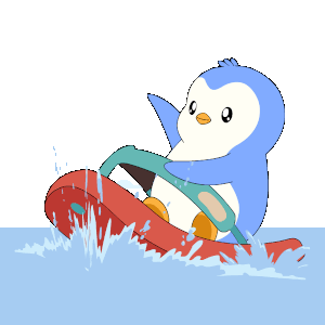 A cute blue and white penguin joyfully rides a red jet ski, splashing water, celebrating the happy Friday weekend.