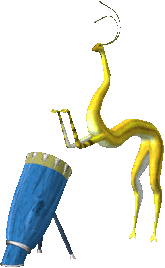 Finfin, the unique banana deer, rhythmically plays a blue drum with its long, slender limbs, creating a whimsical musical scene.