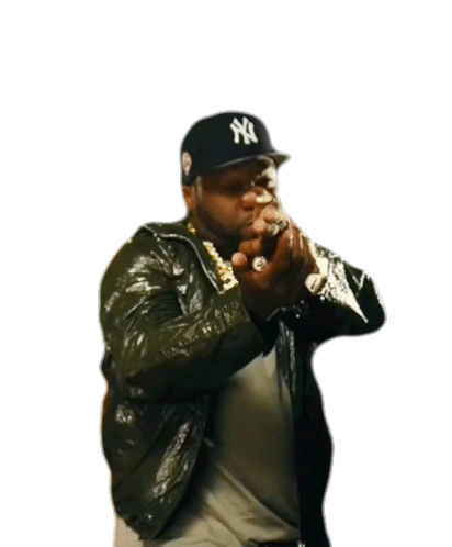 50 Cent, also known as Curtis James Jackson III, makes a finger gun gesture while wearing a NY hat and shiny jacket.