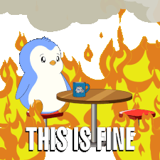A cartoon penguin calmly sips coffee at a table while surrounded by flames, with the ironic caption 'This Is Fine'.