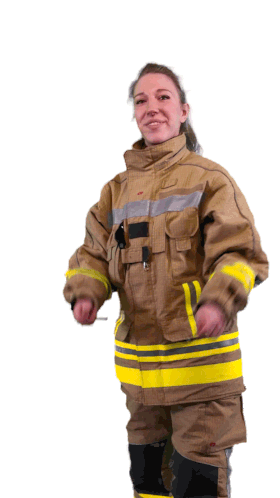 A smiling firefighter woman in full Btl Brandschutz gear, gesturing with both hands, inviting interaction.